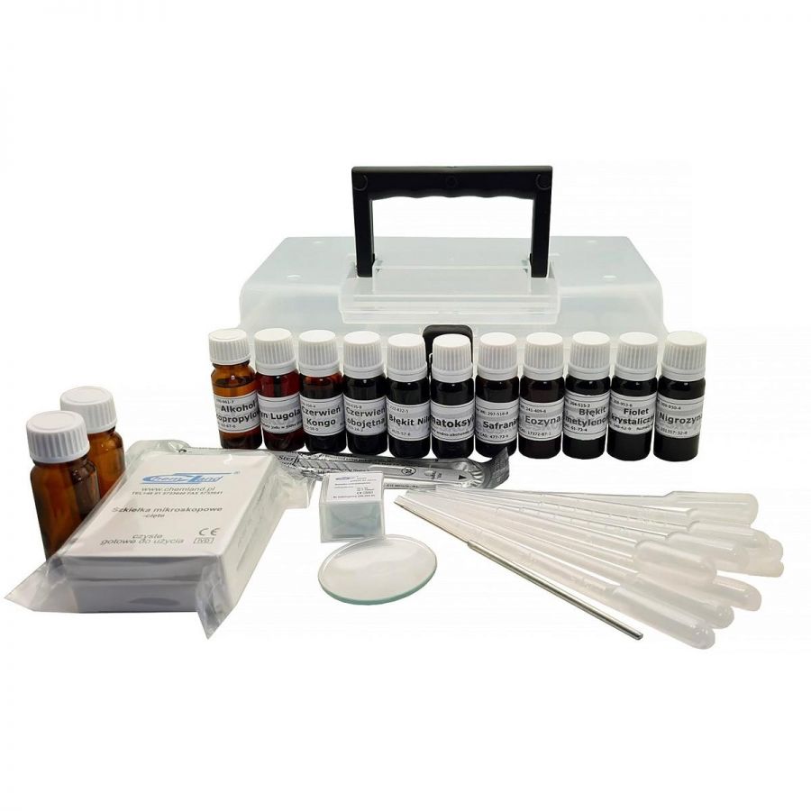 Zestaw barwników i narzędzi preparacyjnych