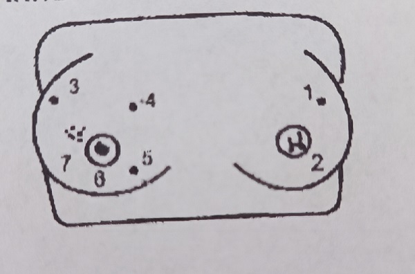3. Rak piersi: zlokalizowany w zewnętrznym górnym kwadrancie, o twardej strukturze, o nieregularnej powierzchni, około 3 cm