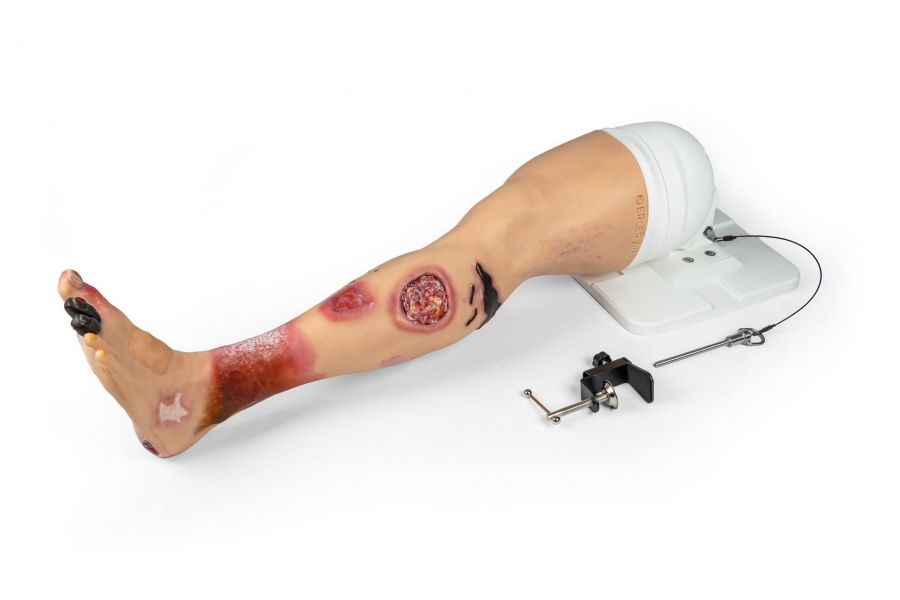 Symulator pielęgnacyjny nogi został zaprojektowany do edukacji medycznej i szkoleń w zakresie wizualnej oceny i różnicowania szerokiego zakresu patologii kończyn dolnych i rodzajów ran. Symulator ten dokładnie odwzorowuje ludzką nogę od stopy do połowy uda. Wspiera umiejętności diagnostyczne w zakresie pielęgnacji ran, oceny naczyniowej, dermatologii i ogólnego szkolenia medycznego.