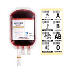 Każdy worek Practi-Blood Bag zawiera 8 wymiennych naklejek z grupami krwi: A-, A+, B-, B+, AB-, AB+, 0-, 0+.