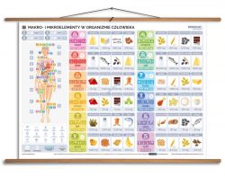Ścienna plansza szkolna do biologii i edukacji zdrowotnej przedstawiająca makroelementy i mikroelementy budujące materię ożywioną, ich rolę w organizmie człowieka oraz główne źródła w pożywieniu. Biogeny, makroelementy i mikroelementy to pierwiastki niezbędne do prawidłowego rozwoju i funkcjonowania organizmu. Pełnią funkcję budulcową, regulują równowagę kwasowo–zasadową są niezbędne w prawidłowym przebiegu procesów metabolicznych.