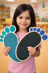 Sensory Feet Calm to zestaw zaprojektowany z myślą o wyciszeniu układu nerwowego i budowaniu poczucia bezpieczeństwa podczas ćwiczeń. Miękkie i przyjemne w dotyku powierzchnie, takie jak filc, plusz czy pianka gumowa, łączą się z gładkimi materiałami, na przykład aluminium i stalą szczotkowaną. Dzięki temu łatwo prowadzić łagodne przejścia faktur, wspierając samoregulację, redukcję napięcia i powrót do skupienia po aktywności poznawczej.